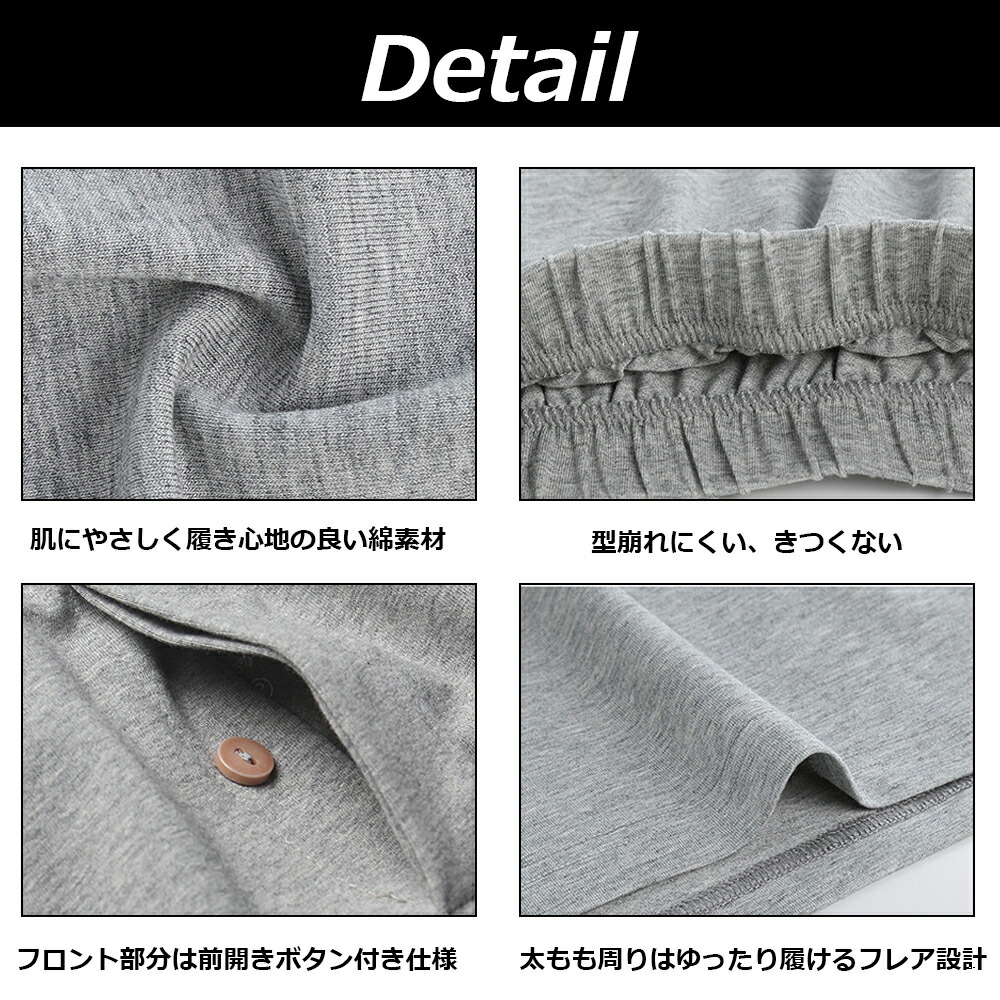幅広いウエストゴムの裏側も綿で包まれ、肌に優しい!ボタン付きの前開き仕様でトイレの際も快適に!適度なウエスト幅で着心地が良く、スマートなシルエットにこだわったデザインと高い耐久性が特徴です。ゆとりある適度の脇丈でゆったりと着用いただけます。