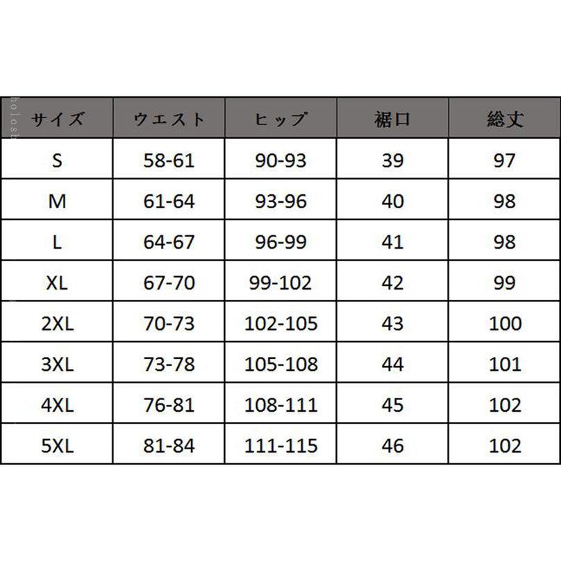S パンツ丈:96 ウエスト:63-73 ヒップ:90-93 M パンツ丈:97 ウエスト:67-76 ヒップ:94-97 L パンツ丈:98 ウエスト:70-80 ヒップ:98-101 XL パンツ丈:99 ウエスト:74-84 ヒップ:102-105 2XL パンツ丈:100 ウエスト:78-88 ヒップ:106-109 3XL パンツ丈:101 ウエスト:82-92 ヒップ:110-113 4XL パンツ丈:102 ウエスト:92-102 ヒップ:114-117 商品には個体差がございますので、若干のサイズ誤差は予めご了承下さい。
