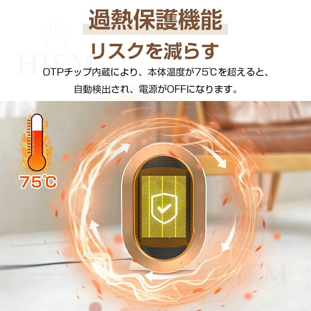 温度75℃以上になった場合、自動的に過熱保護機能が起動され、電源が自動的に切ってくれます。本製品はPSE認証済の電気ファンヒーターで難燃性高い防火素材ABSを採用され、転倒自動OFFや過熱対策など安全対策満載ファンヒーターです。