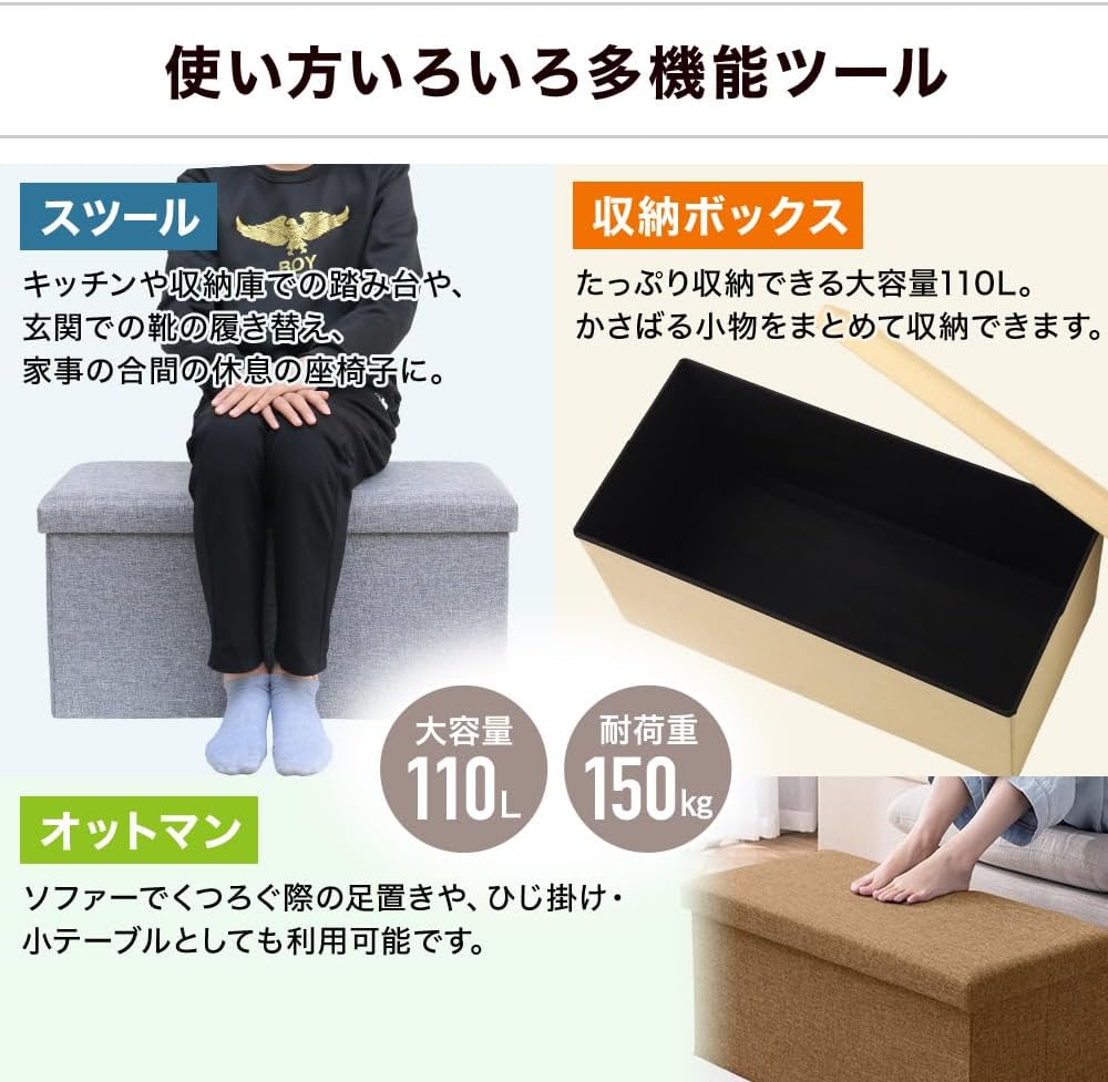 座れる 収納ボックス 収納スツール 幅 ベージュ グレー ピンク ブラウン ライトグレー グリーン パープル 30x30x30cm(30L) 38x38x38cm(55L) 49x31x31cm(48L) 60x35x35cm(75L) 76x38x38cm(110L)