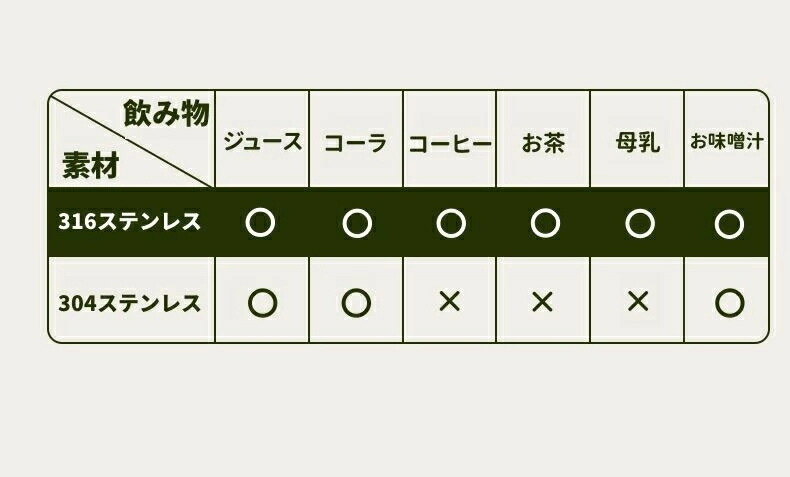 内ビン/316ステンレス、胴部/304ステンレス鋼(アクリル樹脂塗装)、フタ栓/PP・ステンレス、パッキン/シリコーンゴム