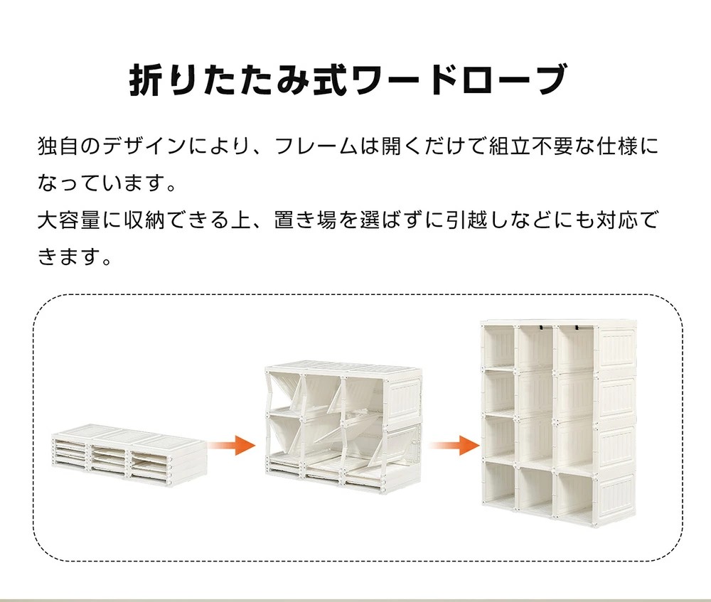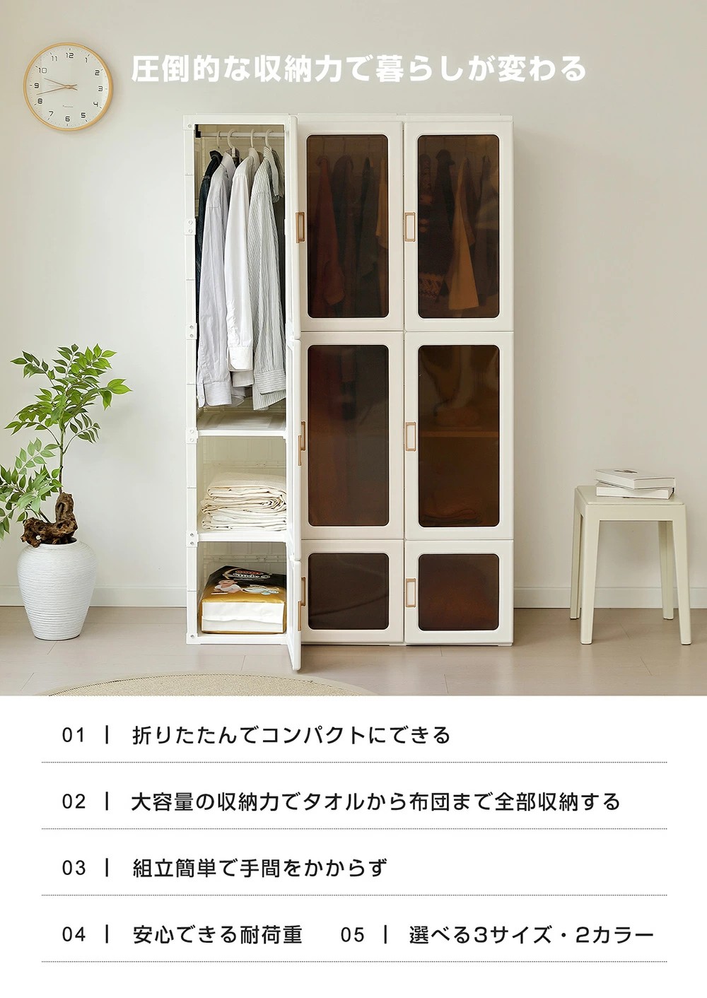 ワードローブ クローゼット 折りたたみ 透明アンバー+ホワイト ホワイト 5段x3列(3ハンガー)104*170cm 4段x3列(2ハンガー)104*136cm 5段x2列(1ハンガー)69*170