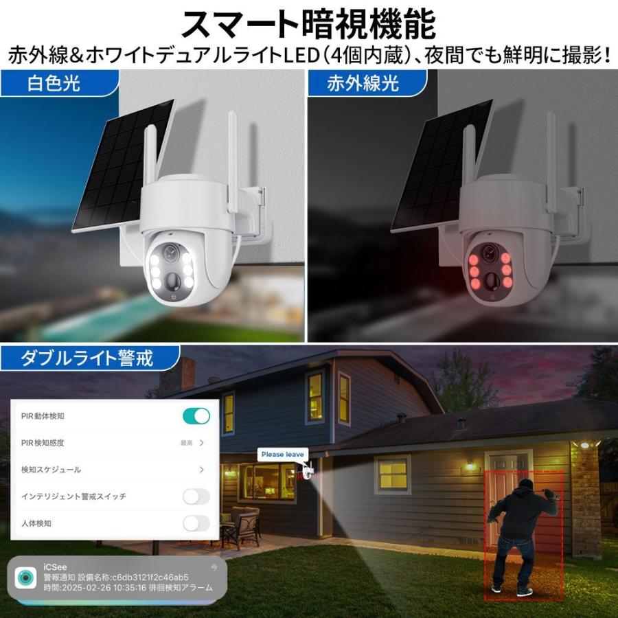 防犯カメラ 家庭用 屋外 スマホ 500万画素 夜間フルカラー 自動追跡 動体検知 自動録画 PIR人体感知 遠隔監視 ソーラー給電 ワイヤレス IP66防水 工事不要 監視カメラ WiFi 配線不要