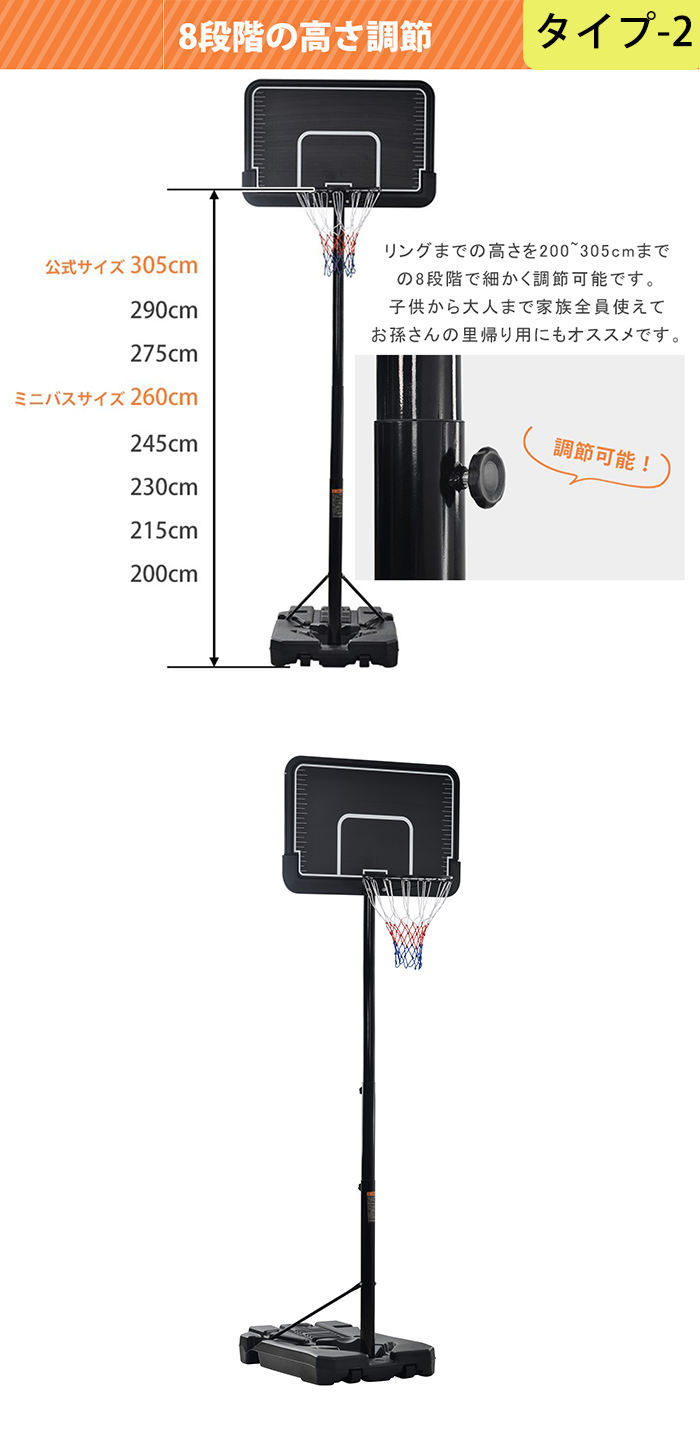 リングの高さ:200-305cm、8段階調整