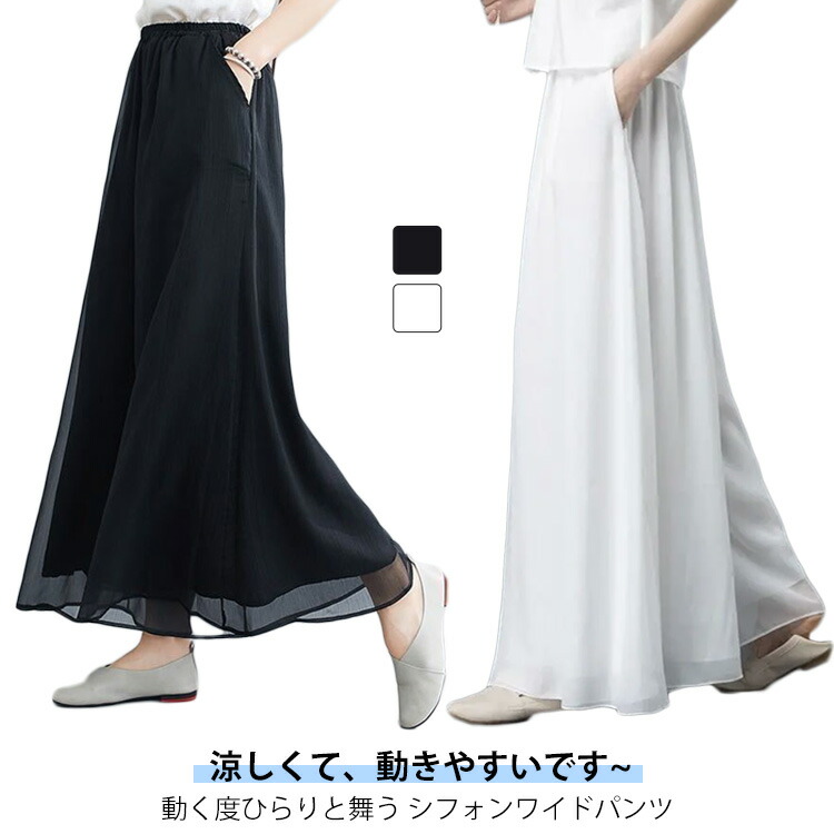 ワイドパンツ レディース シフォン ロング ズボン ガウチョ 着痩せ 爽やか ゆったり カジュアル 夏 通勤 脚長 体型カバー
