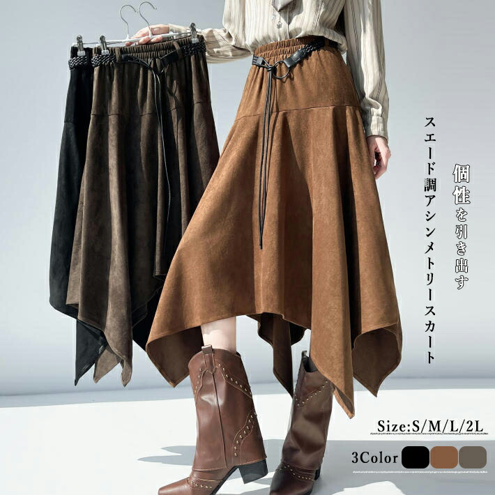 スカート レディース アシンメトリースカート 不規則 ベルト付き スエード調 ハイウエスト ウエストゴム ひざ丈 ミモレ丈 ロング 体型カバー 大きいサイズ 小さいサイズ 個性 春 秋 冬 ボトムス