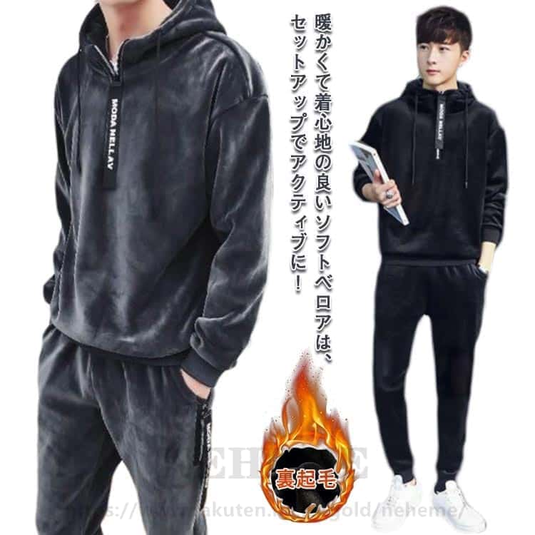 ベロアセットアップ ジャージ スウェット 上下セット メンズ 男性 トレーナー スエット パーカー 長袖 ベロアジャージ 裏起毛 厚手 ハーフジッパー フード付き 部屋着 無地 全2 あったかもこもこ