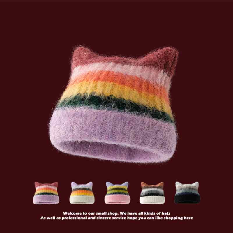 虹のグラデーションニット帽 猫耳帽子 防寒 温かい