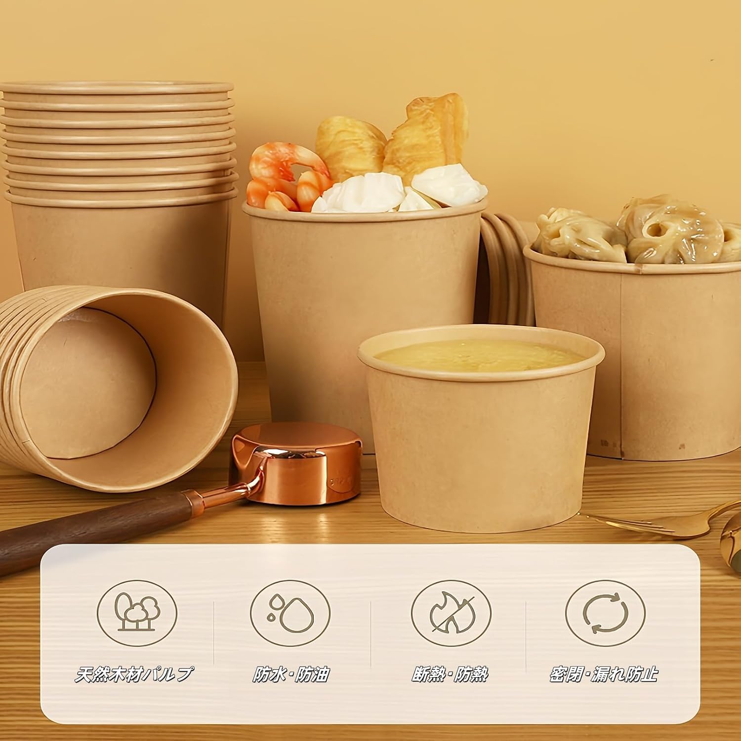 スープカップ 100個 使い捨て 蓋付き 電子レンジ可 冷凍可能 漏れ防止 耐熱厚紙製 テイクアウト容器 家庭用用 ドリンクカップ 丸蓋付き 業務用