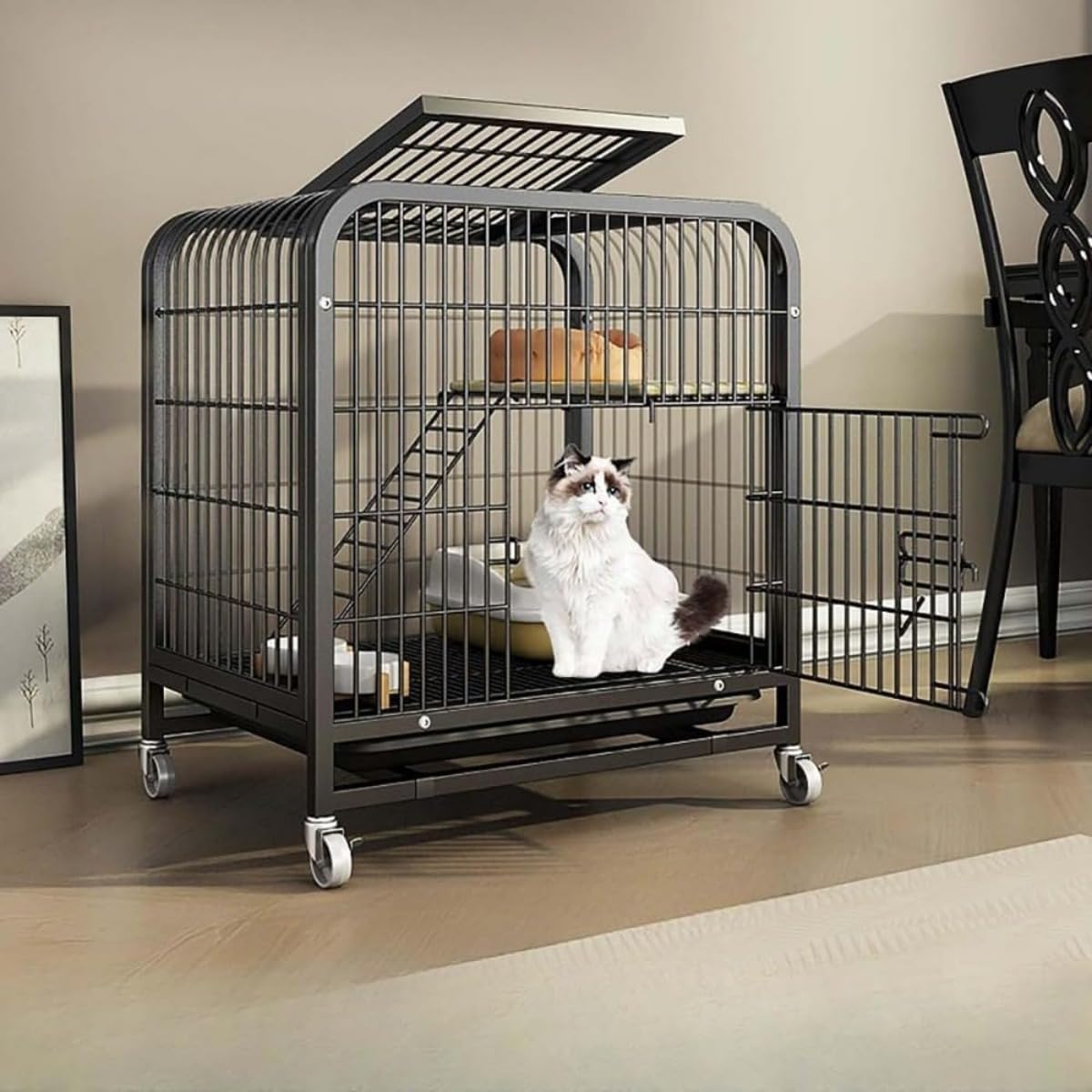 キャットケージ 猫 ケージ 家庭用 室内 大型 動物用ケージ 【ハンモック+トレイ+登り梯子+ストラップ付き キャットハウス 小型 ワンピース占有 キャスター付 猫小屋