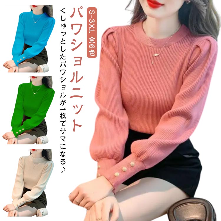 S-3XL ニット パワショル セーター パワショルニット トップス レディース パワーショルダー パフスリーブ 長袖 ボタン付き 秋冬 春 秋 冬 クルーネック リブ きれいめ 上品 ラウンドネック