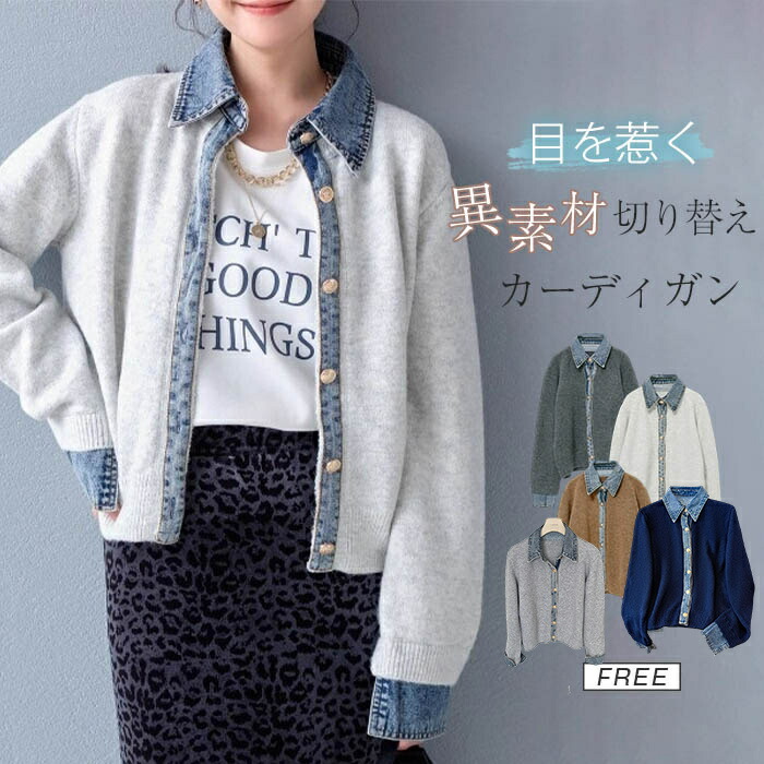 ニット カーディガン レディース 秋冬 ニットカーディガン 切り替え 異素材 デニム切り替え 重ね着風 カーデ アウター フェイクレイヤード トップス 無地 前開き 体型カバー ゆったり シン 羽織り