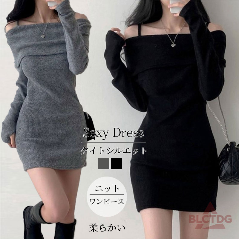 オフショルダー ニットワンピース タイト ミニ 肩紐 ワンピース ニット レディース 大きいサイズ セクシー 春 秋 冬 キャバ ドレス ミニ丈 ミニワンピース ボディコン 通勤 無地