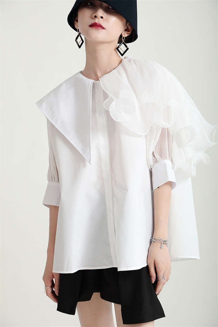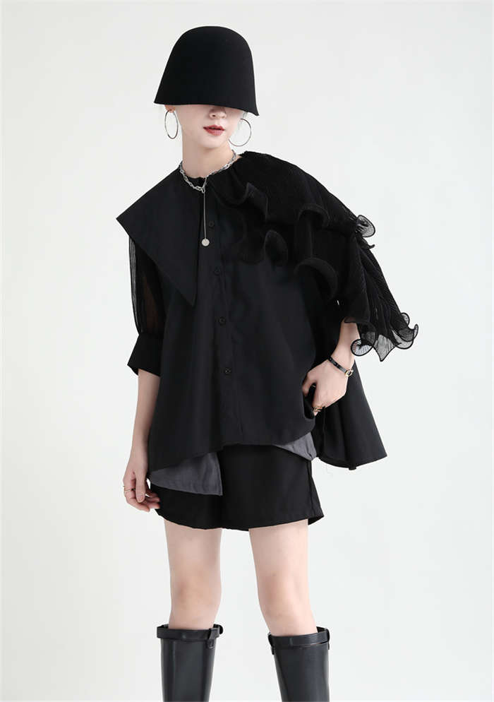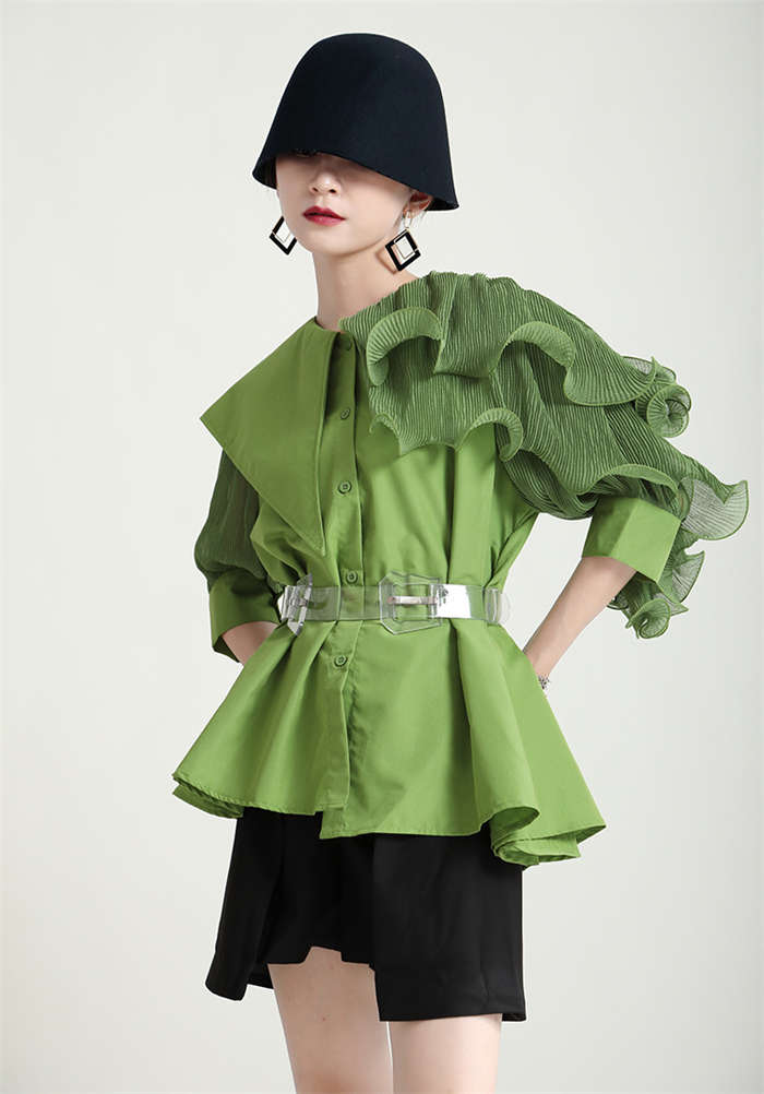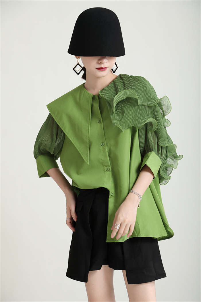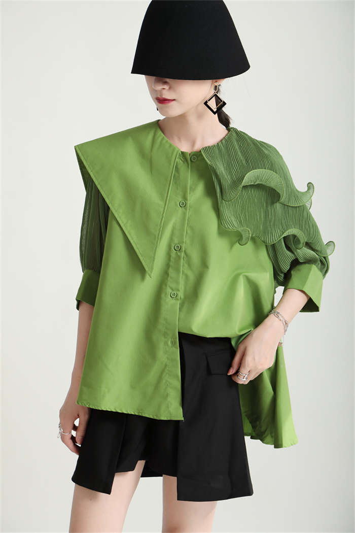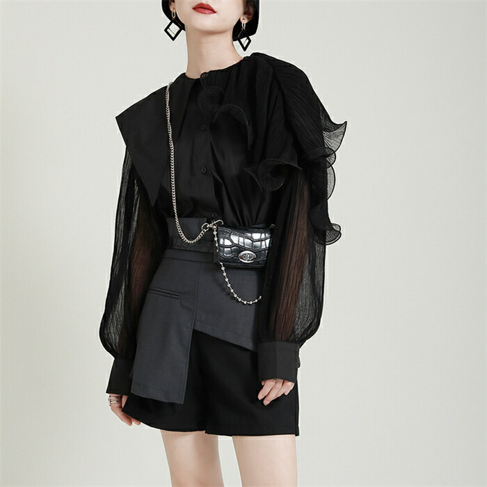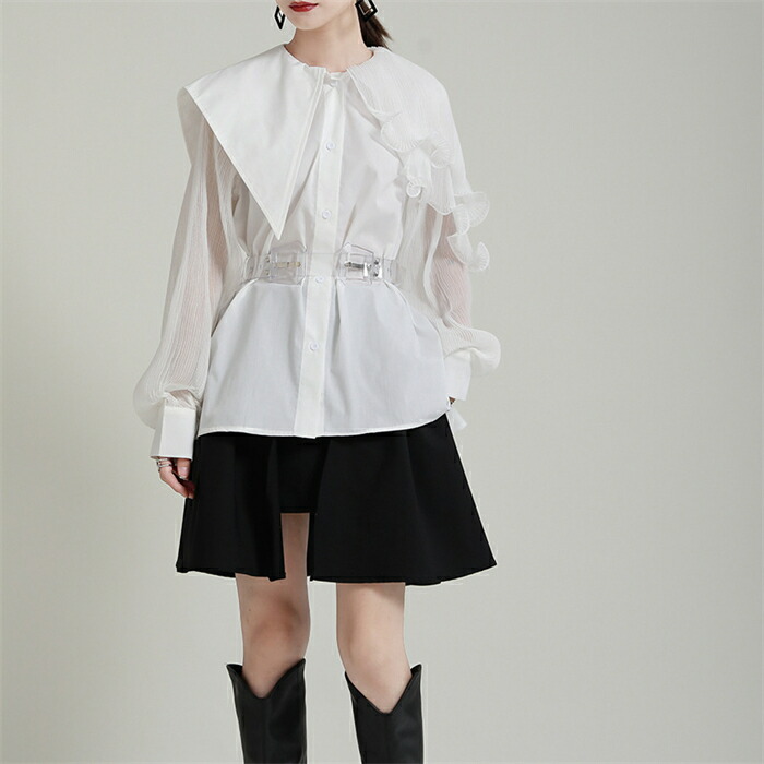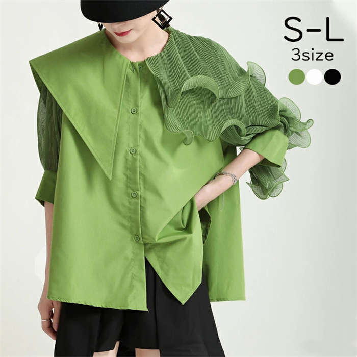 長袖追加 アシンメトリーフリルカラー トップス シャツ ブラウス 続々登場 ホワイト ブラック グリーン S M L
