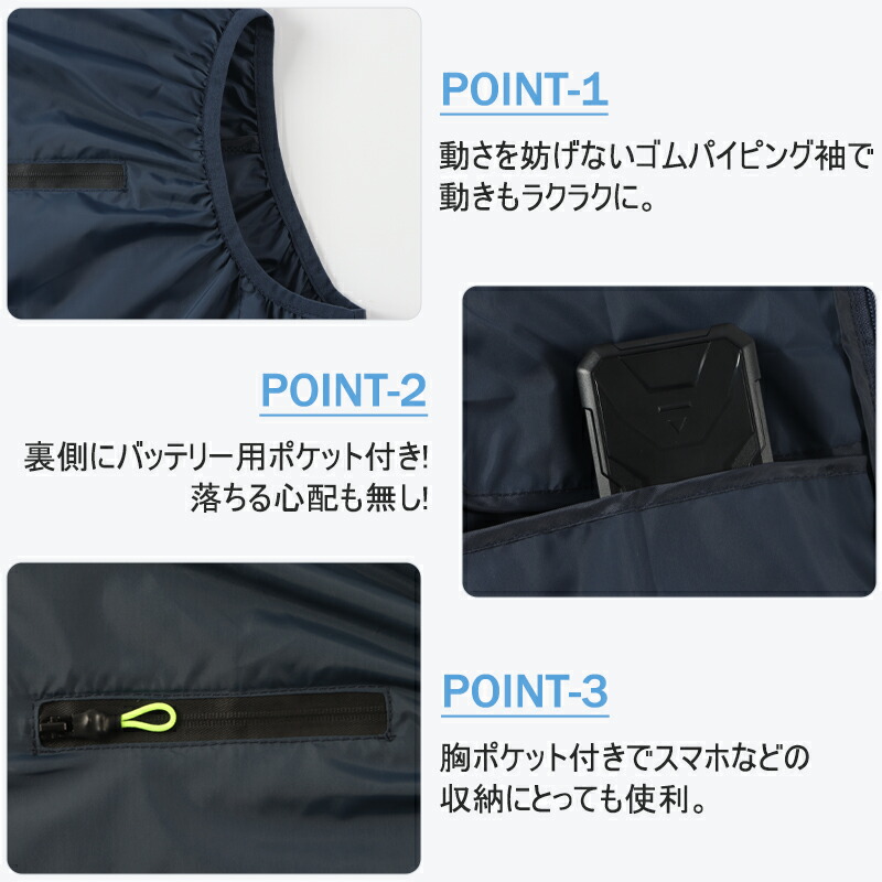 猛暑の夏に、工場や屋外作業などエアコンの使用できない環境で作業する人たちへの高温対策のクールファンベストです。高温の環境でも楽に仕事して作業効率を上げることができるファン付きベスト。外気を取り入れ、汗の蒸発を促して、体温が有効的に下がる。早くて汗を蒸発させるので大量の汗をかく不快感が改善できます。また、汗がすぐに蒸発するので、汗臭が減り、あせもなど、汗による皮膚病になりにくくなります。皮膚をさっぱりにして、体を守ってくれます。