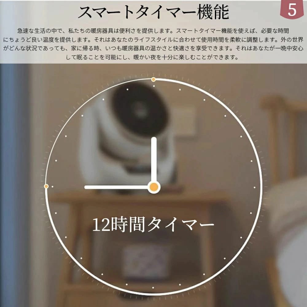 セラミックファンヒーターは、設定した時間後に自動的に電源が切れになるタイマー機能が備わっており、生活リズムやシーンに合わせて1時間刻みでタイマーを設定、最大で12時間まで可能です。電源を消し忘れないようにするだけでなく、目覚める時間に合わせて設定することもできます。ファンヒーターにはリモコンも付属しており、寒い冬の間でも暖かいベッドやソファから出ずに、指先で簡単に操作できます。