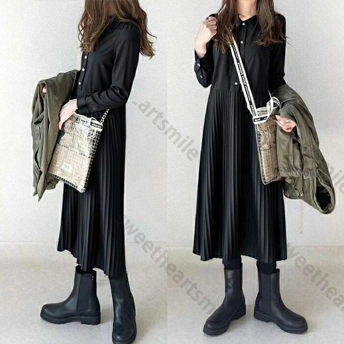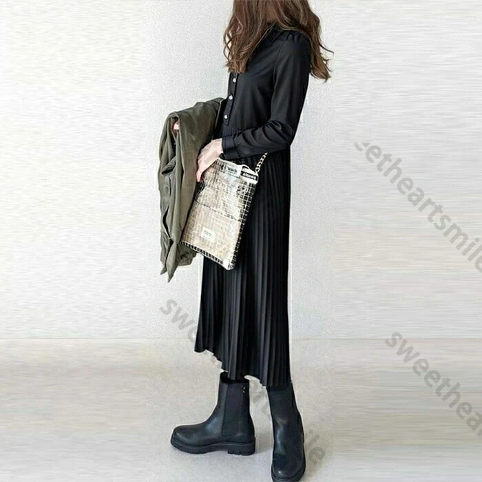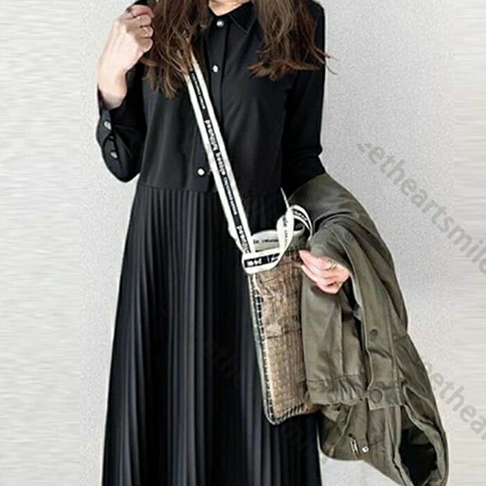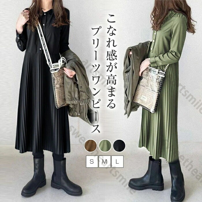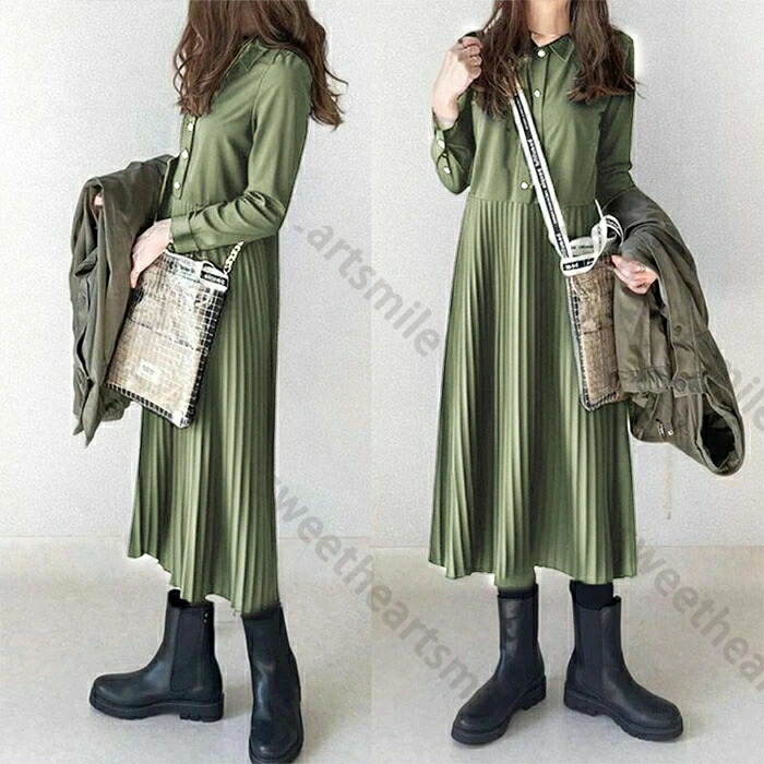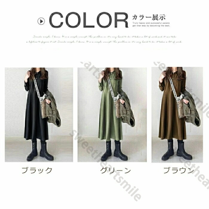 シャツワンピース 秋 冬 きれいめ 長 ブラック グリーン ブラウン S M L