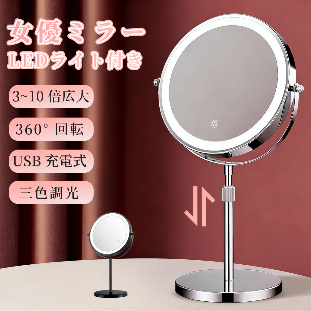 卓上ミラー 高さ調整 女優 ミラー 拡大 鏡 付き 両面ミラー 3倍5倍10倍拡大鏡 女優ミラー 卓上 丸 おしゃれ かわいい 円形ミラー ライト付き 軽量 丸鏡 化粧 メイク鏡