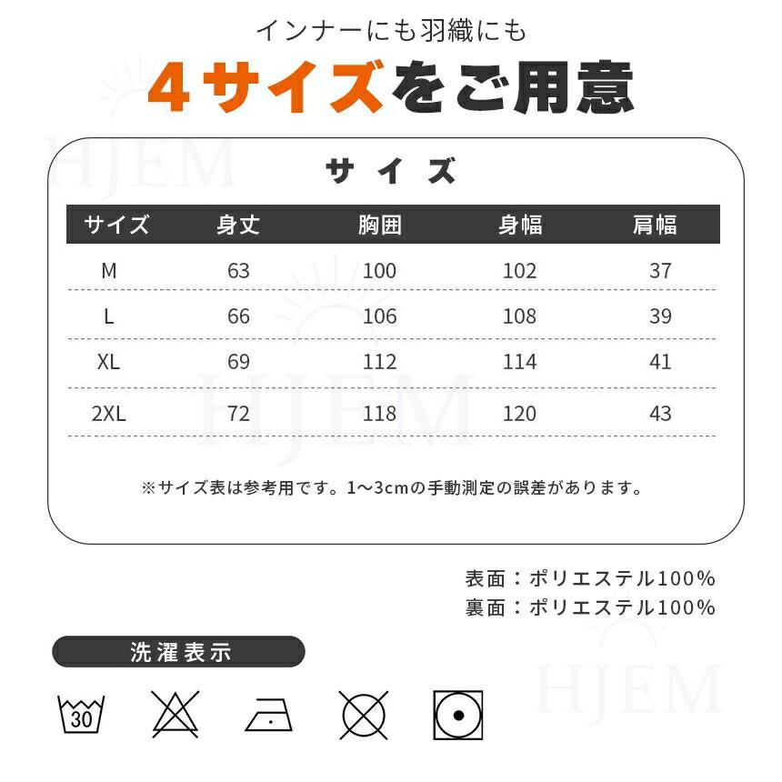 内部填充物は100%ポリエステル繊維です。良質なダウンジャケット用の原料として、軽薄で、手触りが細かくて、柔らかくて、保温が良くて、変形しにくいです。手洗いはもちろん、洗濯機でも洗えます。(御注意:洗濯機で洗う場合は、ベストの損傷を防ぐ為に洗濯ネットに入れてお洗いください。洗濯の前にモバイルバッテリーを取り外してください)