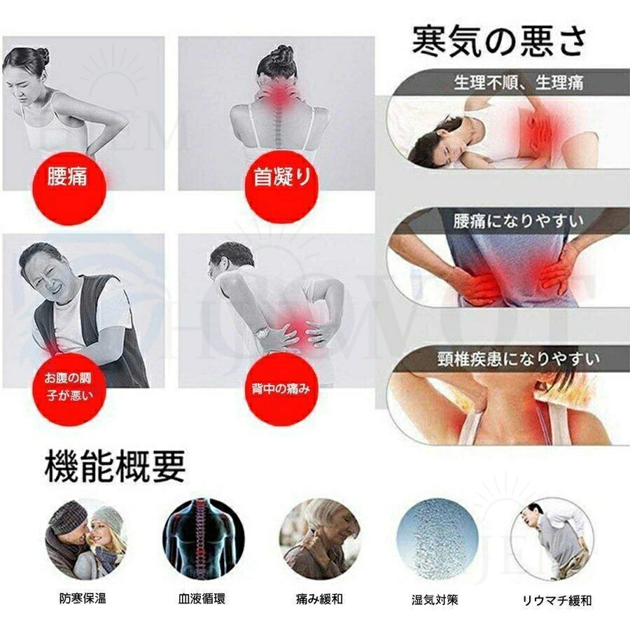 ヒーター枚数:11枚ブラック:4ボタンで(前、後、肩)独立調温、青-ブルー-赤(低-中-高)順次に調温します。