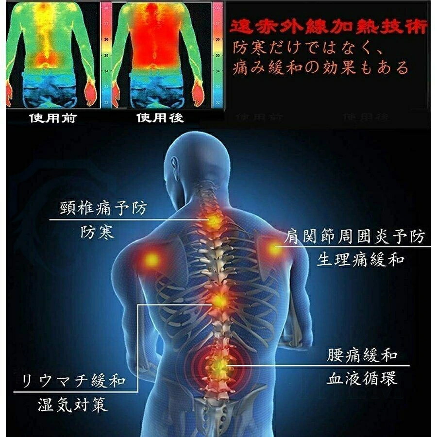 日本製グラフェン繊維ヒーターを採用し、電源を入れた後、約5秒ぐらい温まり始め、30秒ほど暖かさが広がります。加熱ベストの中身には中綿入り、ヒーターとの組み合わせで熱を逃さず、重ね着では得られない確実な暖かさを与えます。約3秒で発熱スタート。首 肩 前面 背面の4箇所から温めたい部分をお好みで選択できます。 赤ランプ 高温(65℃)白ランプ 中温(55℃)青ランプ 低温(45℃)グリーンランプの3段階から温度設定ができ、ボタンの色で温度段階が一目で分かります。