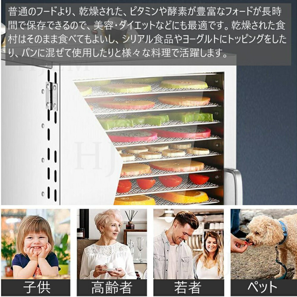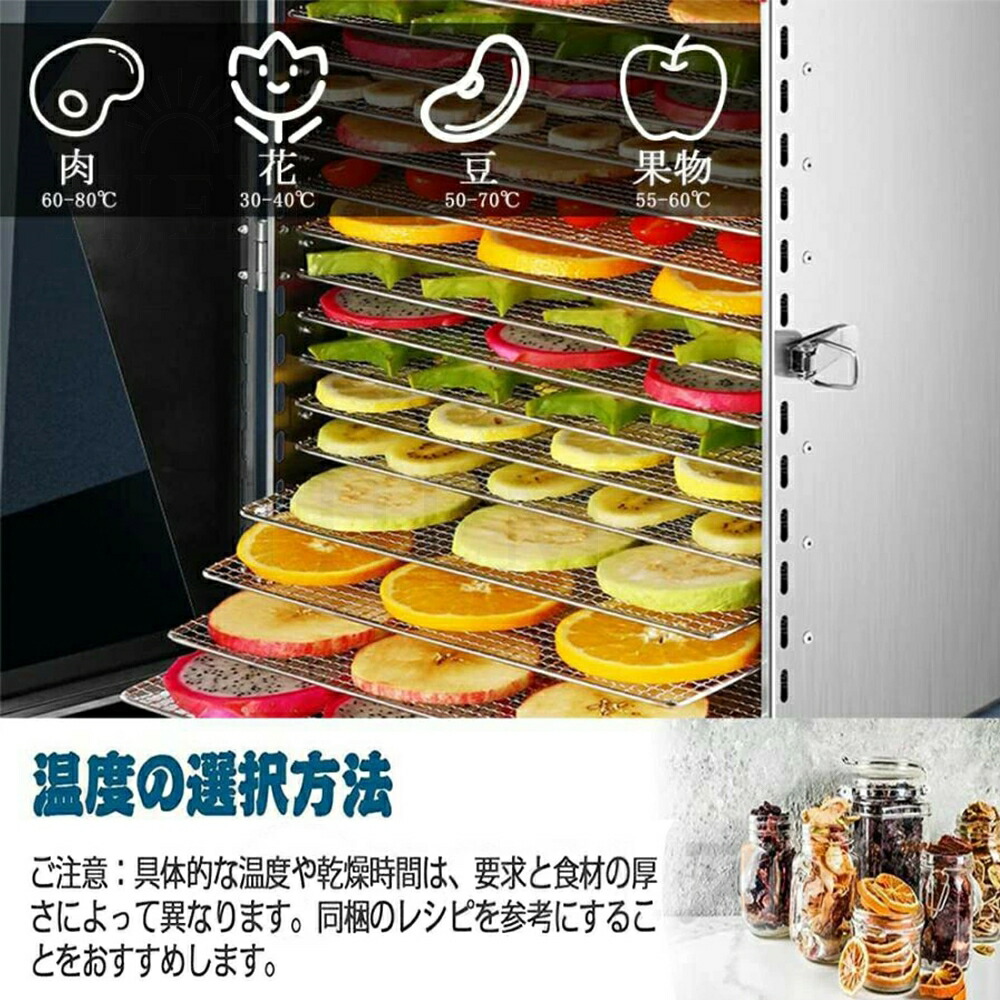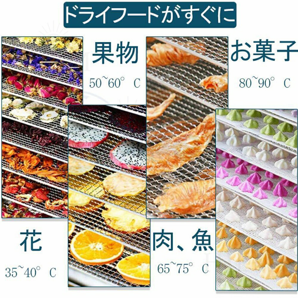弊社のフルーツドライヤーはプラスチック制フルーツドライヤーと異なり、ファンは底面ではなく背面に配置されているため、各層の食材はより均等に乾燥されます。背面ファン2個付き、360度循環の熱風で全トレイをしっかり加熱します。30-90℃の低温・高温乾燥に対応しています。干し野菜やドライフルーツ、ジャーキー、干し芋、ヨーグルト作りなど様々な食品の乾燥を行うことができます。