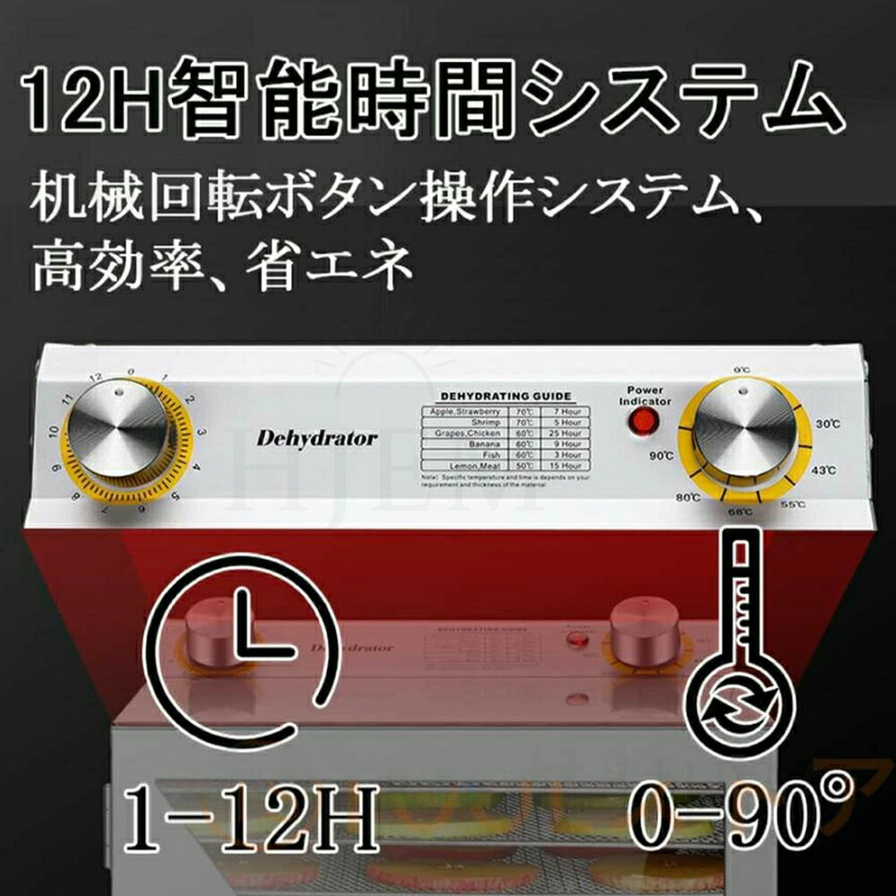 機械回転ボタンで温度・作業時間簡単に設定できます。温度調節30-90℃調節できます。タイマー12時間設定できます。手軽に乾燥野菜やドライフルーツを作れます。家族の健康だけでなく、愛犬の健康まで守れる嬉しい商品です。音仕様のモーターを採用し、作動音は約45-50dB、夜間運転でも静かです。