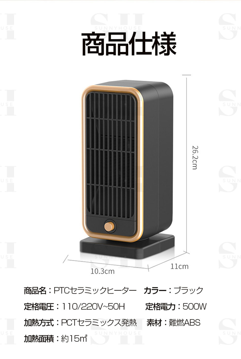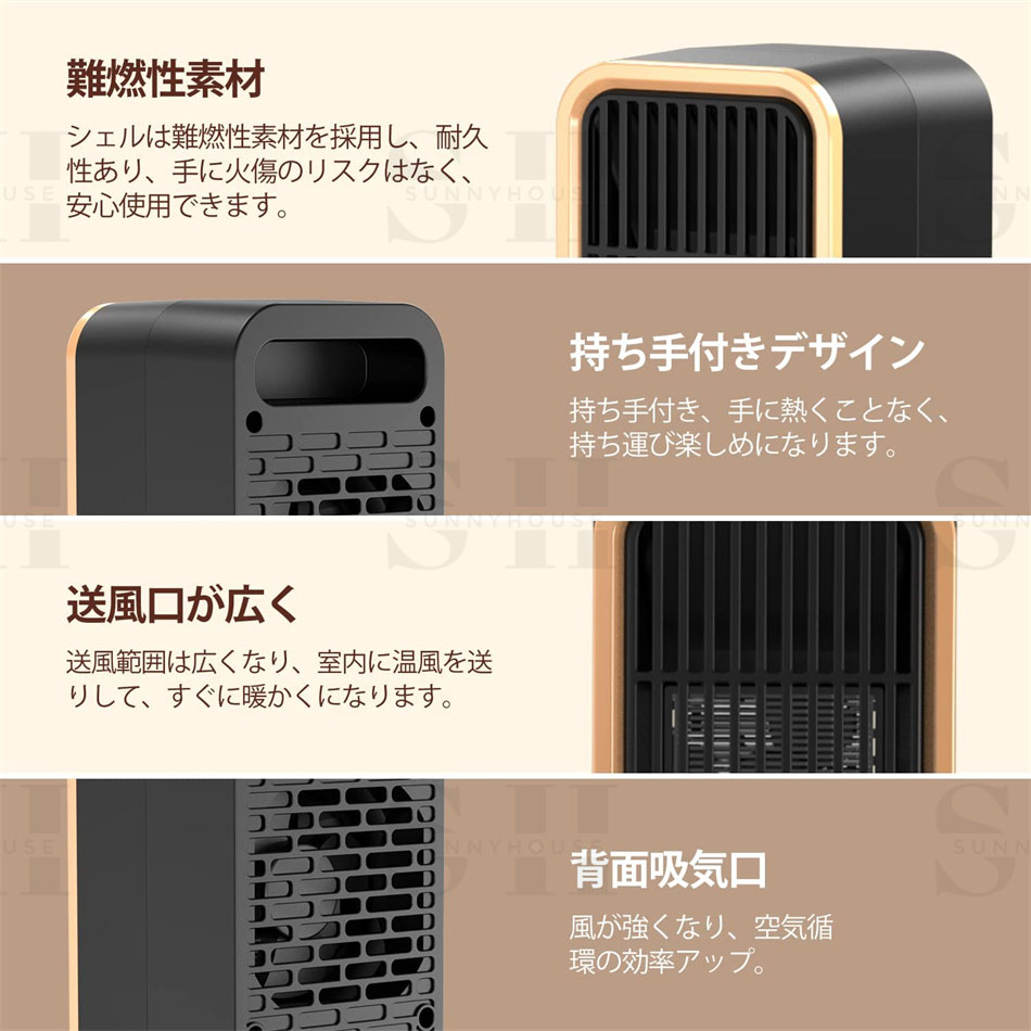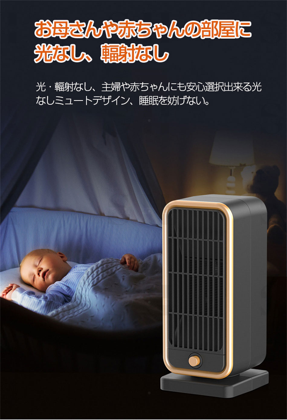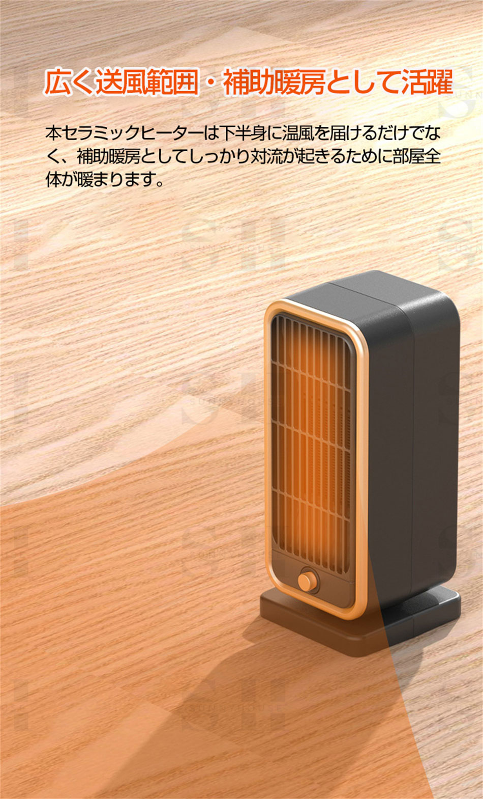 【五つの安全対策】1.温度ヒューズ:過剰に暑くなり過ぎた場合、自動で発熱を感知し,回路を遮断します。2.転倒時自動OFF機能:傾斜角度が15度より大きいにすると、底部のスイッチが、感知すると運転を停止します、安全の役割を果たします。3.セラミックヒーター:灯油等の燃料を燃やすファンヒーターとは異なり、電気でセラミックを発熱させ空気を温めるので有害な排気ガスが出ません。換気する必要がなく、狭い場所での長時間使用も可能です。4.防火素材:本品はABS素材を採用して、火事を効果的に防止できます。5.主スイッチ付き:前面にはスイッチがあります。ワンクリック起動;