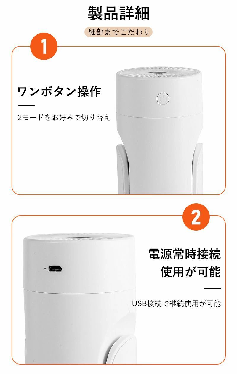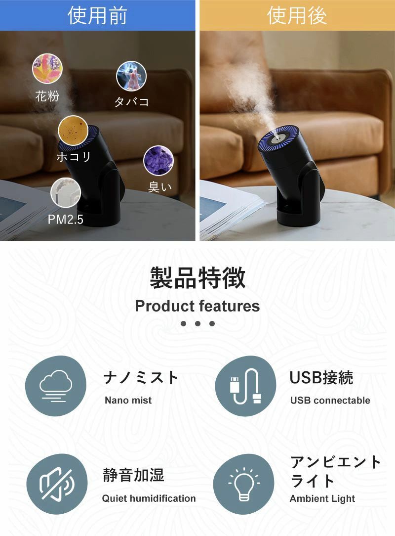 小型加湿器はとてもコンパクトで、デスクの上で使用しても仕事や作業の邪魔になりませんので、デスクの上での使用でもご安心です。本製品は付属USBケーブルを差しながらのみ、ご使用頂けます。