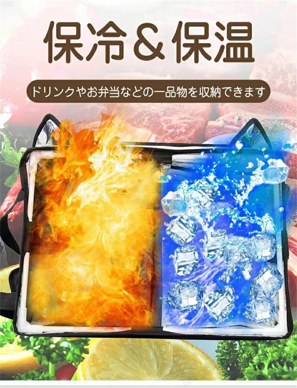 【保温/保冷】季節を問わず、全部適用します。バックの裏側は断熱用のミラマット及び汚れ防止用のアルミホイル素材を採用し、有効に空気流通を防ぎます。保温・保冷・ポータブル・安全およびエコのため、料理用配達用デリバリー、遠足のキャンプ、来客を接待する、飲み物、冷凍食品、弁当コールドチェーン輸送。