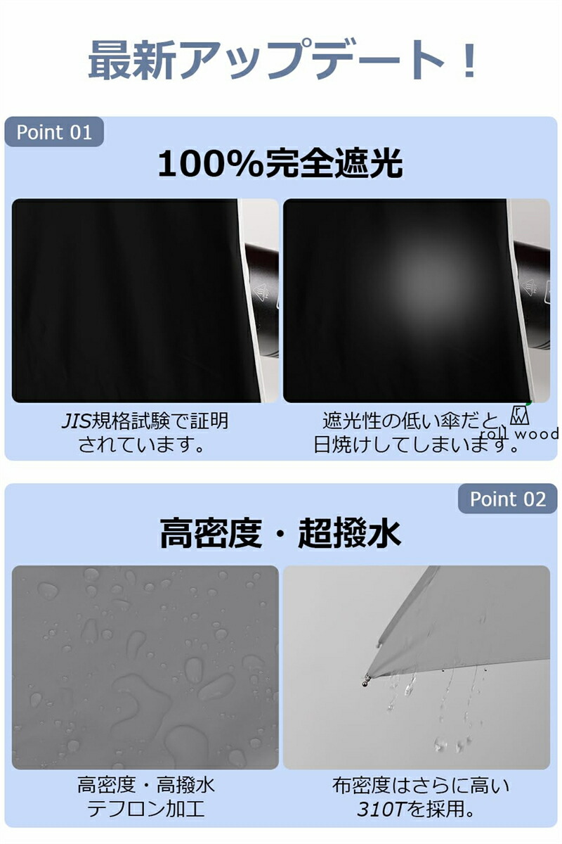 高密度傘布と遮光ブラックラバーコーティングを採用。卓越した遮光・遮熱性能を実現。紫外線100%カット・UPF50+基準をクリアし、肌を有害紫外線から保護。