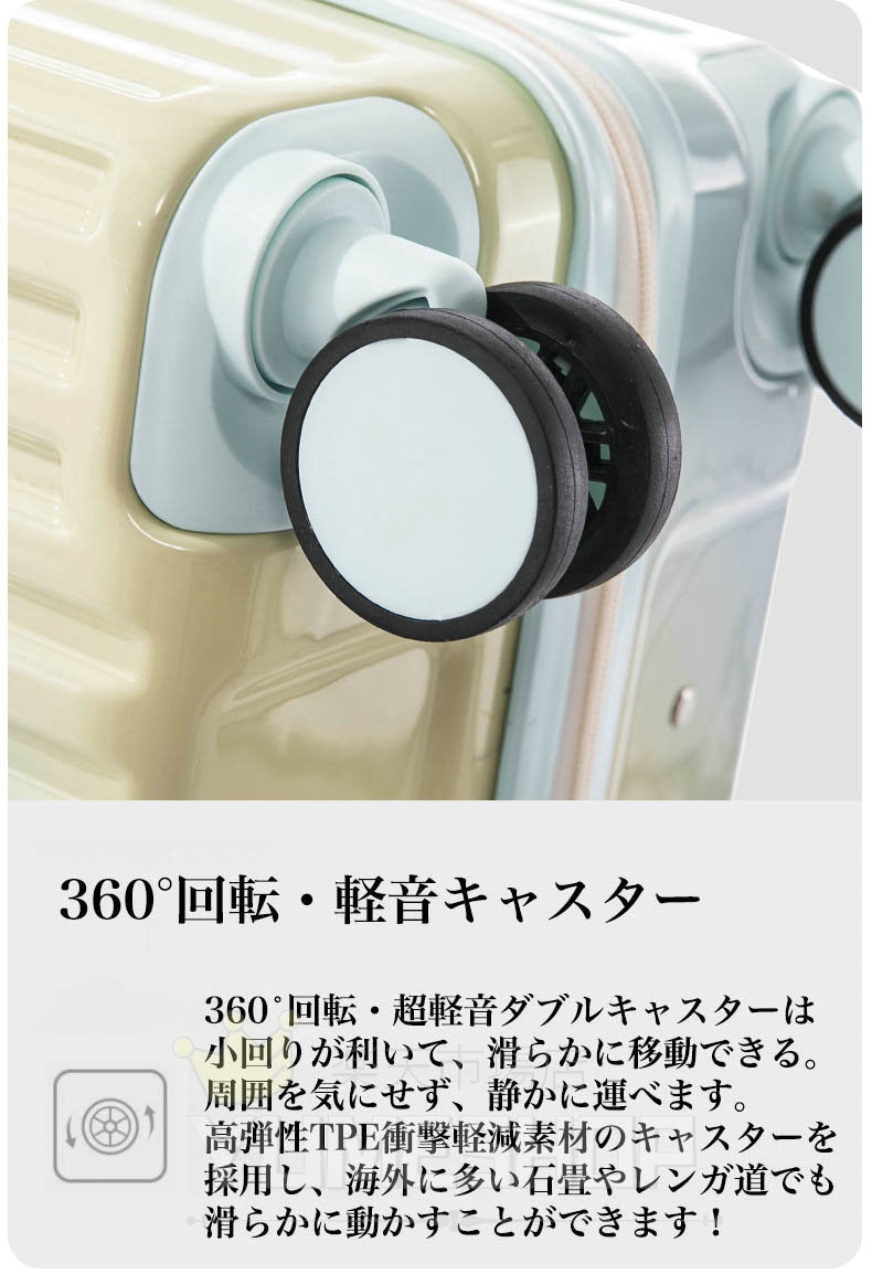 【耐衝撃静音ダブルキャスター】高弾性のTPE衝撃軽減素材のキャスターを採用し、より静かで耐摩耗性も向上しています。スムーズか滑行を実現しながら、360度の自由回転もできます。