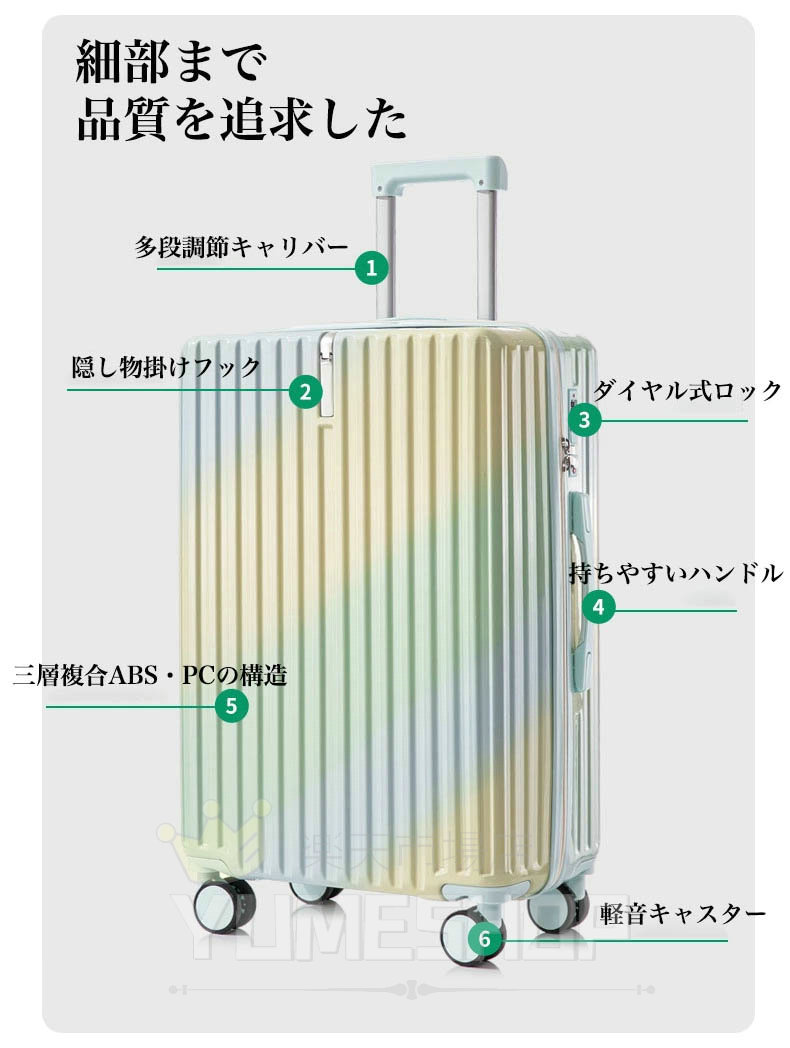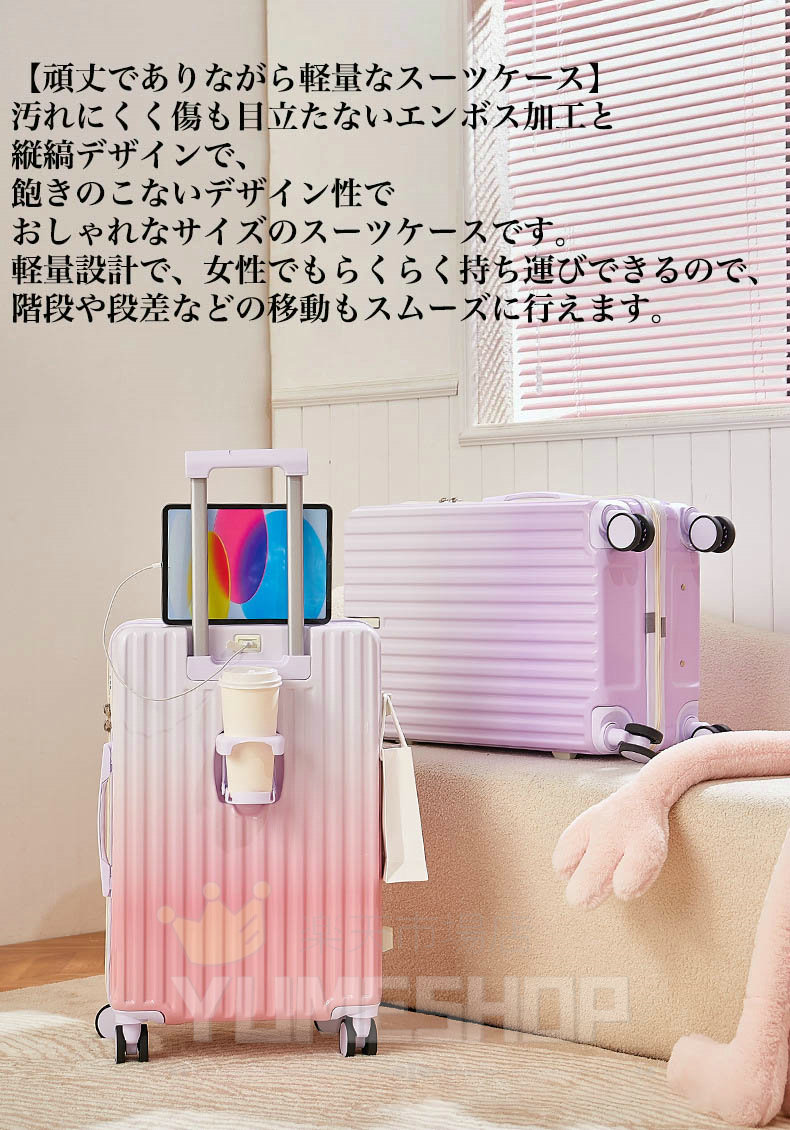 【丈夫かつ軽いPC ABS+PCボディ】スーツケースはABS樹脂とPCでの混合素材を採用しており、純ABS樹脂より耐衝撃性に優れています。エンボス加工、傷つきにくい。縦縞デザインにより、シンプルかつファッションです。
