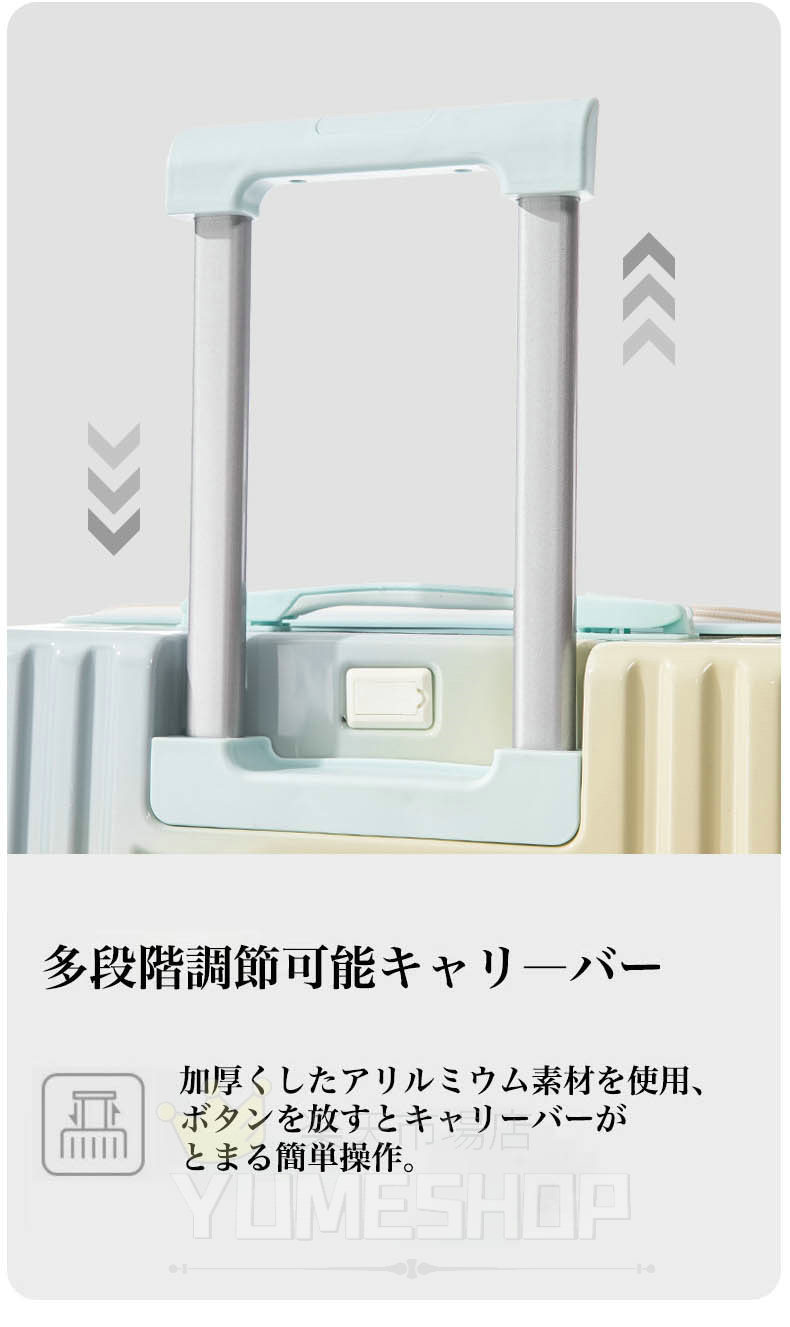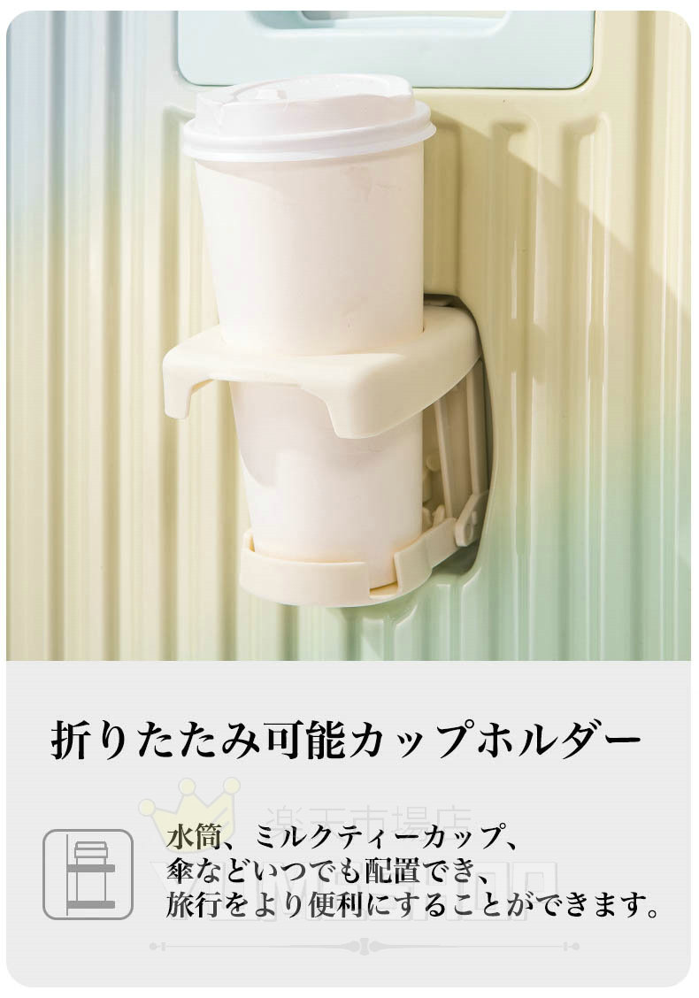 【三段調節キャリバー&カップホルダー】アルミニウム製の超軽量のキャリバーは伸縮可能で、ご自分の身長に合わせて、スムーズな三段階調整が可能です。耐振性に優れるデザインで荷物を引きかける時、しっかりしています。また、滑りにくいソフトハンドルで長い時間の手提げでも手は疲れません。水筒、ミルクティーカップ、傘などいつでも配置でき、旅行をより便利にすることができます。