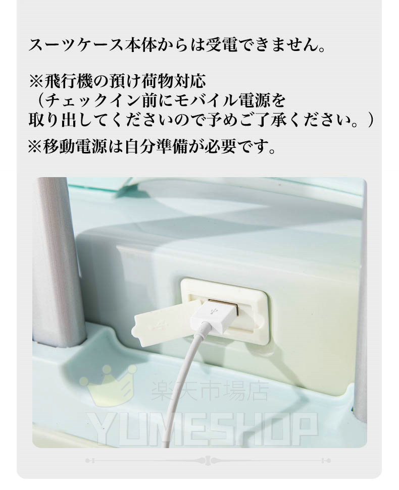 【USBポートの充電方法】スーツケース本体からは受電できません。