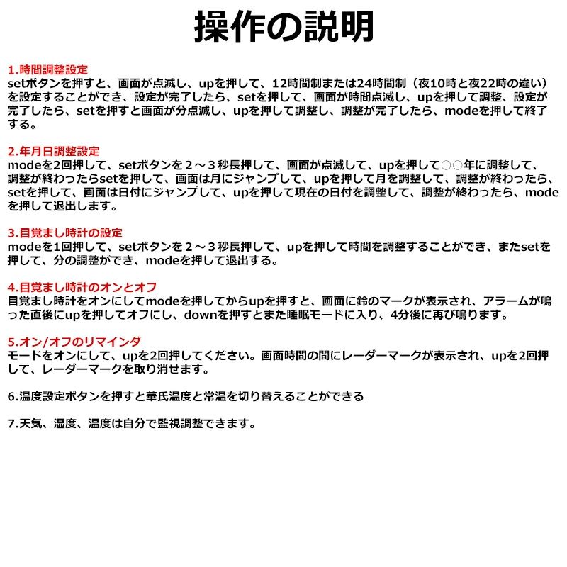 ディスプレイ表示パターン:時刻/ 曜日/ 温度/ 時刻/ 月日