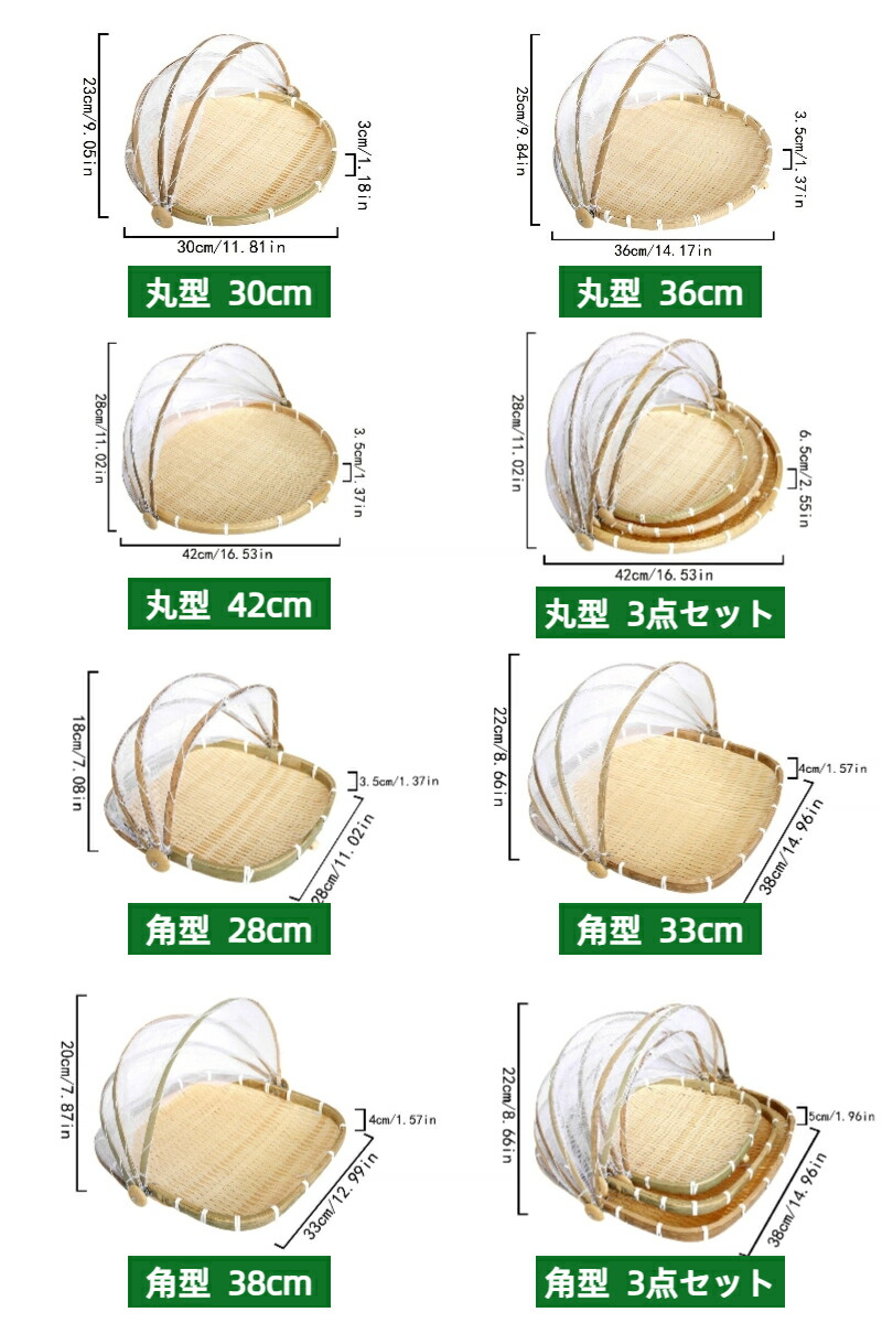 竹ざる 水切りザル ネット付き 籐 竹 キッチン用品 食器 調理器具 豊富な品揃え 角型 丸型 30cm 36cm 42cm 28cm 33cm 38cm 3点セット