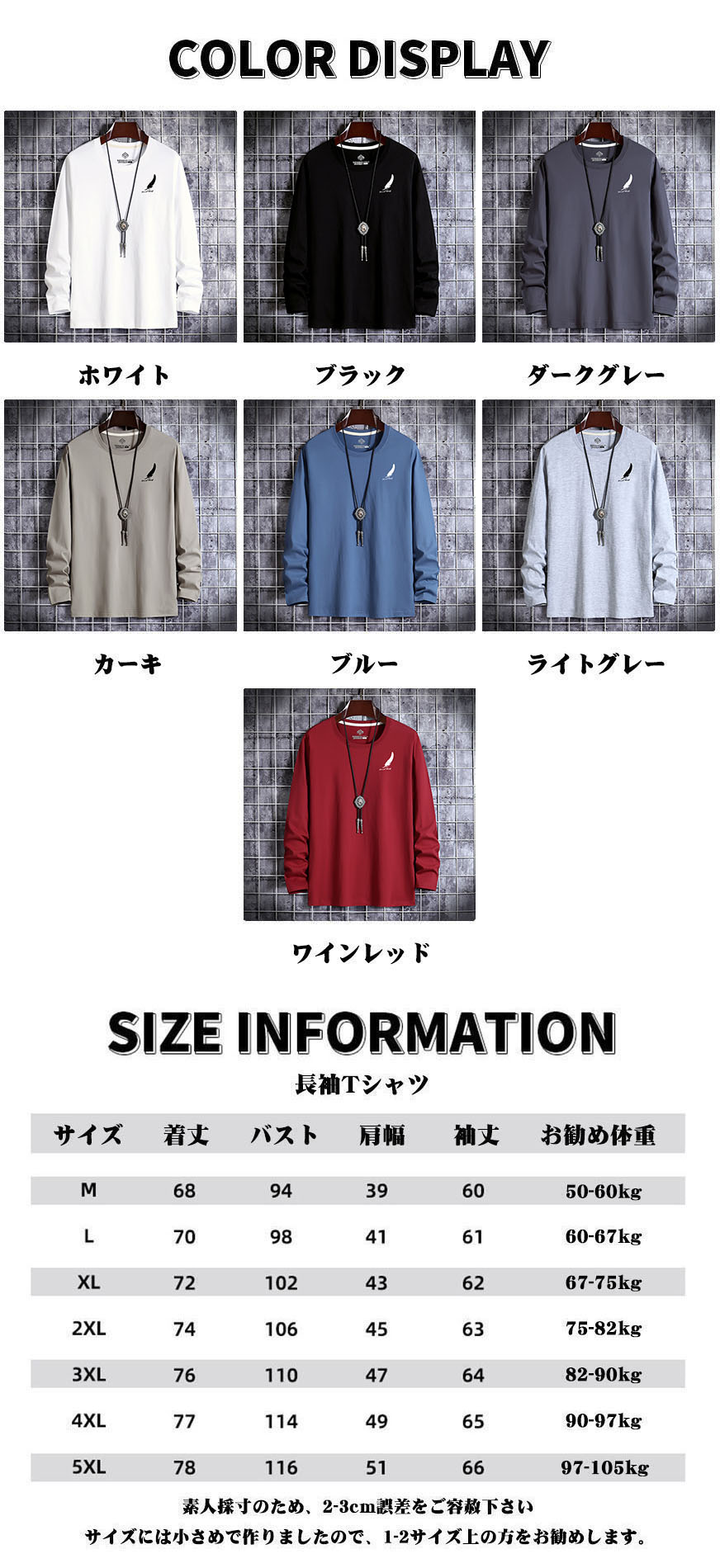 55%OFF Tシャツ メンズ 長袖 メンズファッション 人気 ホワイト ブラック ダークグレー カーキ ブルー ライトグレー ワインレッド M(S相当) L(M相当) XL(L相当) 2XL(L/LL相当) 3XL(LL/3L相当) 4XL(3L/4L相当) 5XL(4L/5L相当)