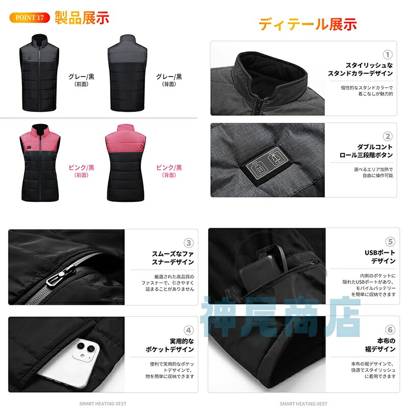 電熱ベスト 電熱ウェア 3段階調温 2 トップス ベスト ジレ 豊富 S M L XL 2XL 3XL 4XL 5XL ブラックピンク ダークグレー