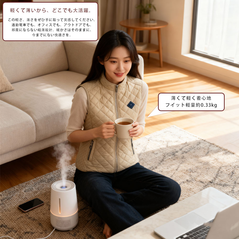 軽量薄型設計で、着ぶくれせずオシャレを楽しみつつ、暖かさを保つことが可能です。