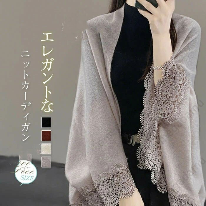 ニットカーディガン レディース レース 秋冬 羽織 無地 ケープコート アウター 秋