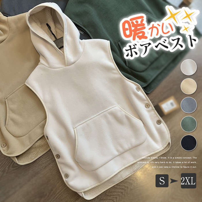 ボアベスト レディース ベスト ジレ ボア ファーベスト フード付き フード ボダン もこもこ ファーコート 無地 秋冬 カジュアル お洒落 トップス 羽織り 袖なし ボアジャケッ ノースリーブ