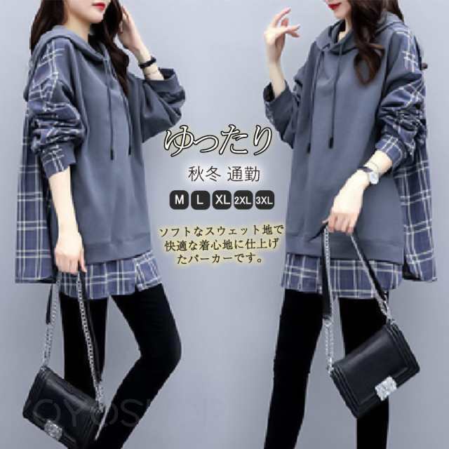 トレーナー レディース パーカー 長袖 トップス スウェット プルオーバー 配色 レイヤード風 通勤 通学 大きいサイ 秋冬
