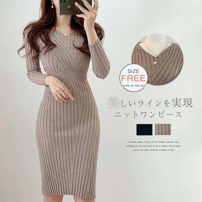 ニットワンピース タイト ワンピース ニット ニットワンピ レディース ワンピ タイトワンピ 秋冬 Vネック ミニ ミニ丈 きれいめ 結婚式 チュニック 長袖 ひざ丈 タイトワンピース ミディア 膝丈