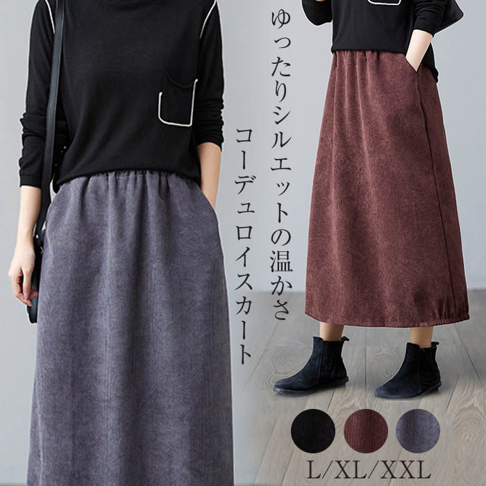 コーデュロイスカート ロング ラインスカート ナチュラル 秋冬スカート 無地 フレアスカート 森ガール系 シンプル 厚手 ゆったり ボトムス 体型カバー 大きいサイズ カジュアル コーデ