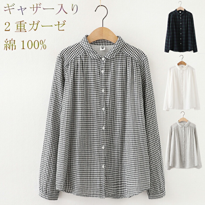 綿100% シャツ レディース 長袖 襟付き ガーゼシャツ トップス 白シャツ コットン 綿 丸襟 シャツブラウス 柔らか ギャザー入り 無地 ホワイト シンプル 通気性 ゆったり チェック柄