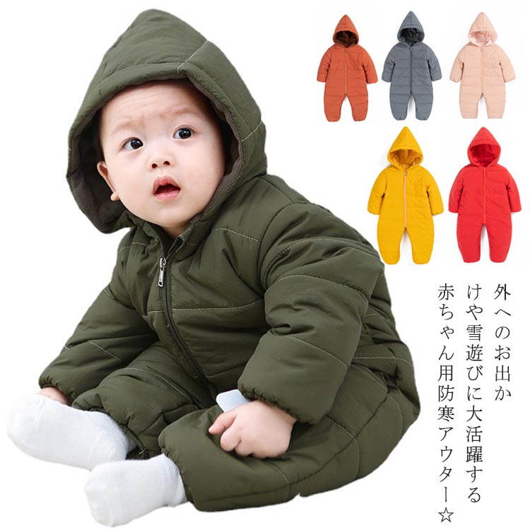 ロンパース 女の子 男の子 長袖 防寒着 つなぎ 秋冬 スノーウェア カバーオール ベビー服 おくるみ フード付き 防寒きぐるみ ダウン風 中綿コート 裏起毛 防風 保温 前開き 雪遊び 新生児 軽量