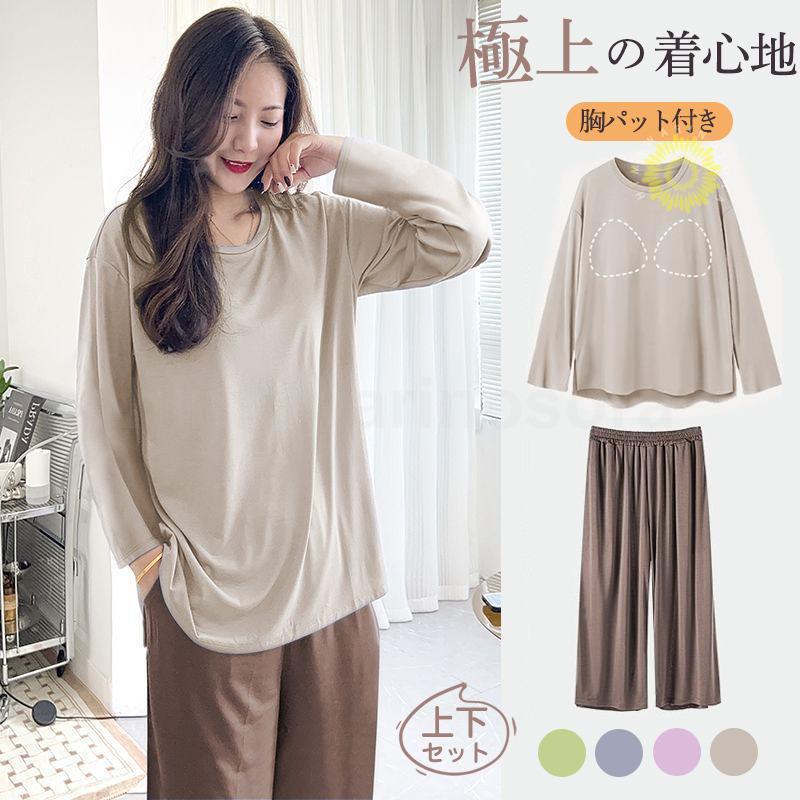 ルームウェア パジャマ レディース 胸パット付き 上下セット 長袖 長ズボン 春 秋 冬 部屋着 寝間着 冷え性対策 外出 柔らかい 通気性