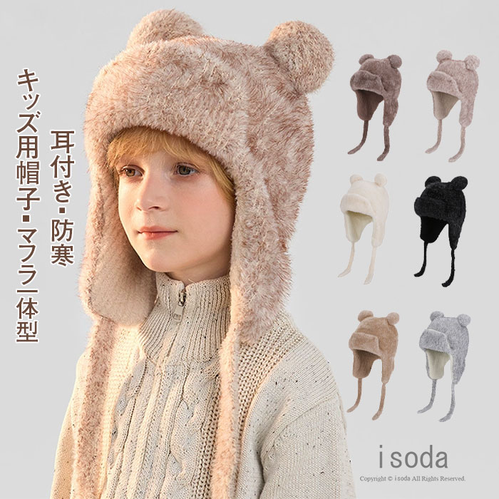 ふわ 暖かい 秋冬 一体 マフラー ベビー帽子 女の子 男の子 耳当て キッズ 帽子 熊耳付き 冬用ハット 防寒帽子 子供用 もこもこ