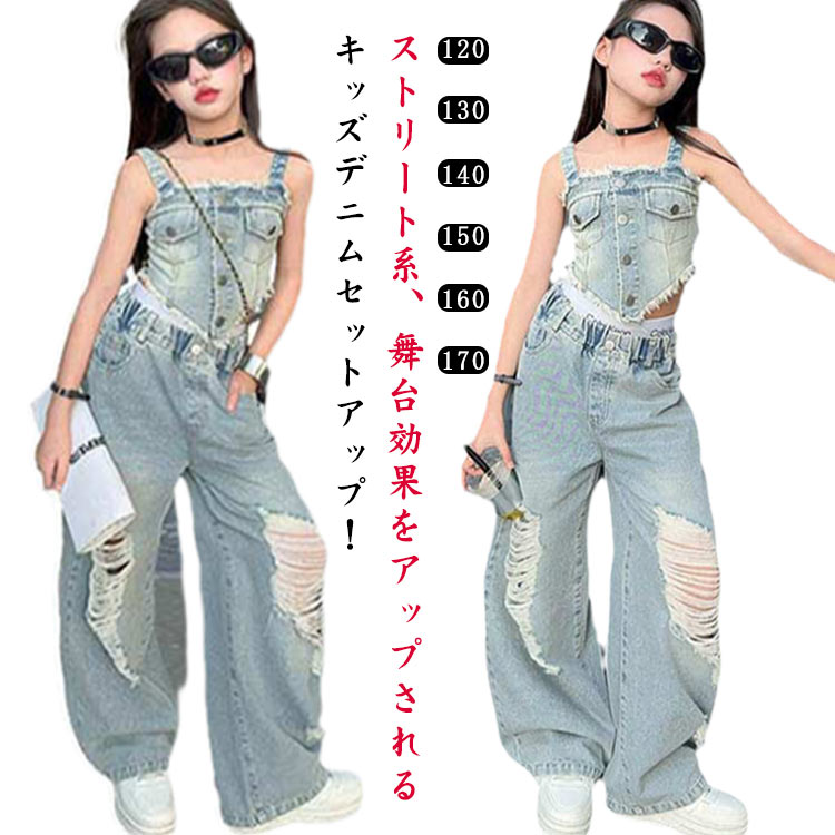 デニム セットアップ キッズ ジャズダンス衣装 子供服 夏 ジャズダンス 衣装 k-pop キャミソール 韓国 女の子 ダメージ デニムパンツ ヒップホップ ポッピング 発表会 演出服 応 チアガール